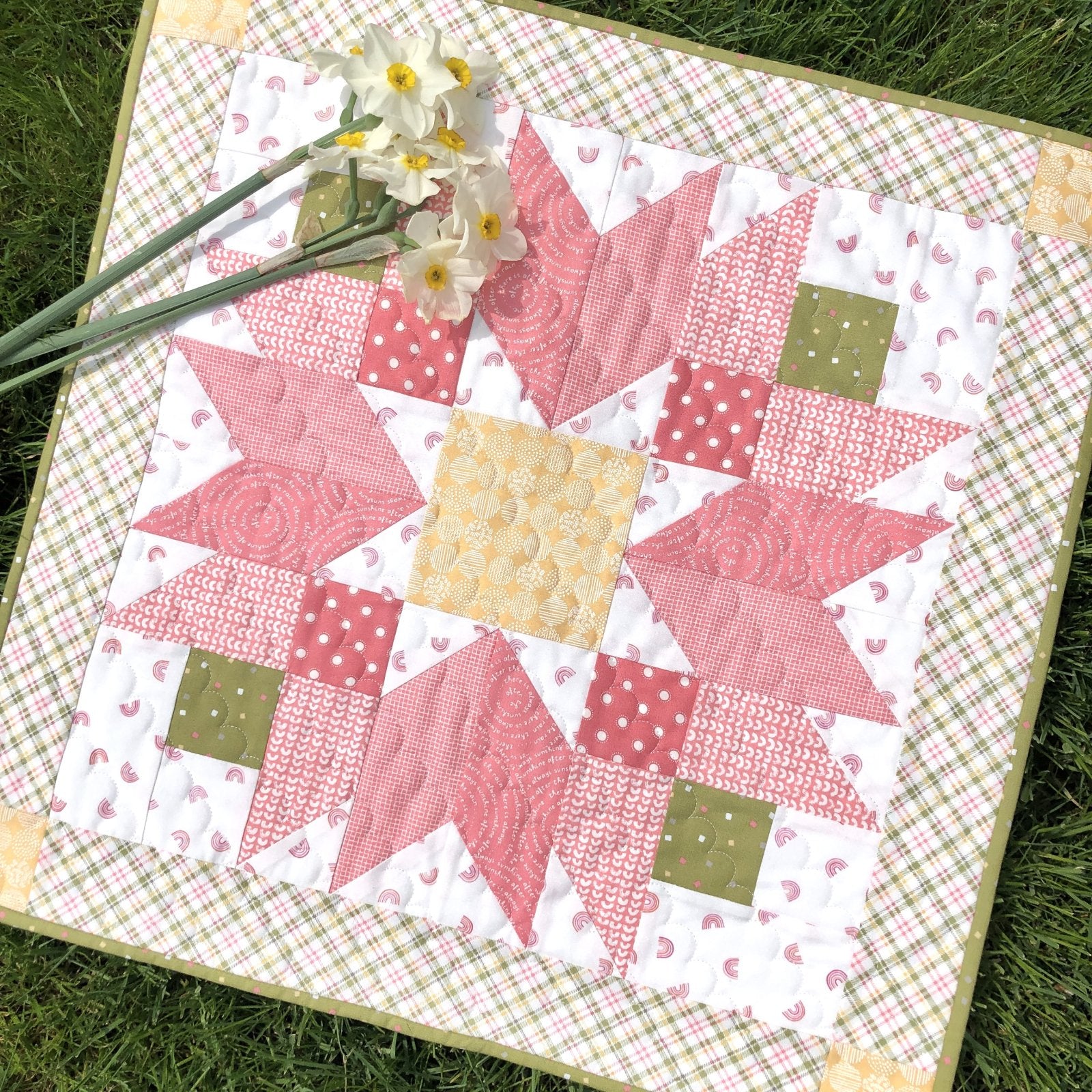 There was a little cottage garden at the end of my grandmother's mountain home filled with one of her favorite flowers - Bachelor Buttons. With their layers of pointed petals in shades of blue, I loved laying in the grass next to them as they blew in the breeze against the bright sky. The Bachelor Button Mini Quilt is a wonderful reminder of those days! It's a quick finish and makes a lovely gift!