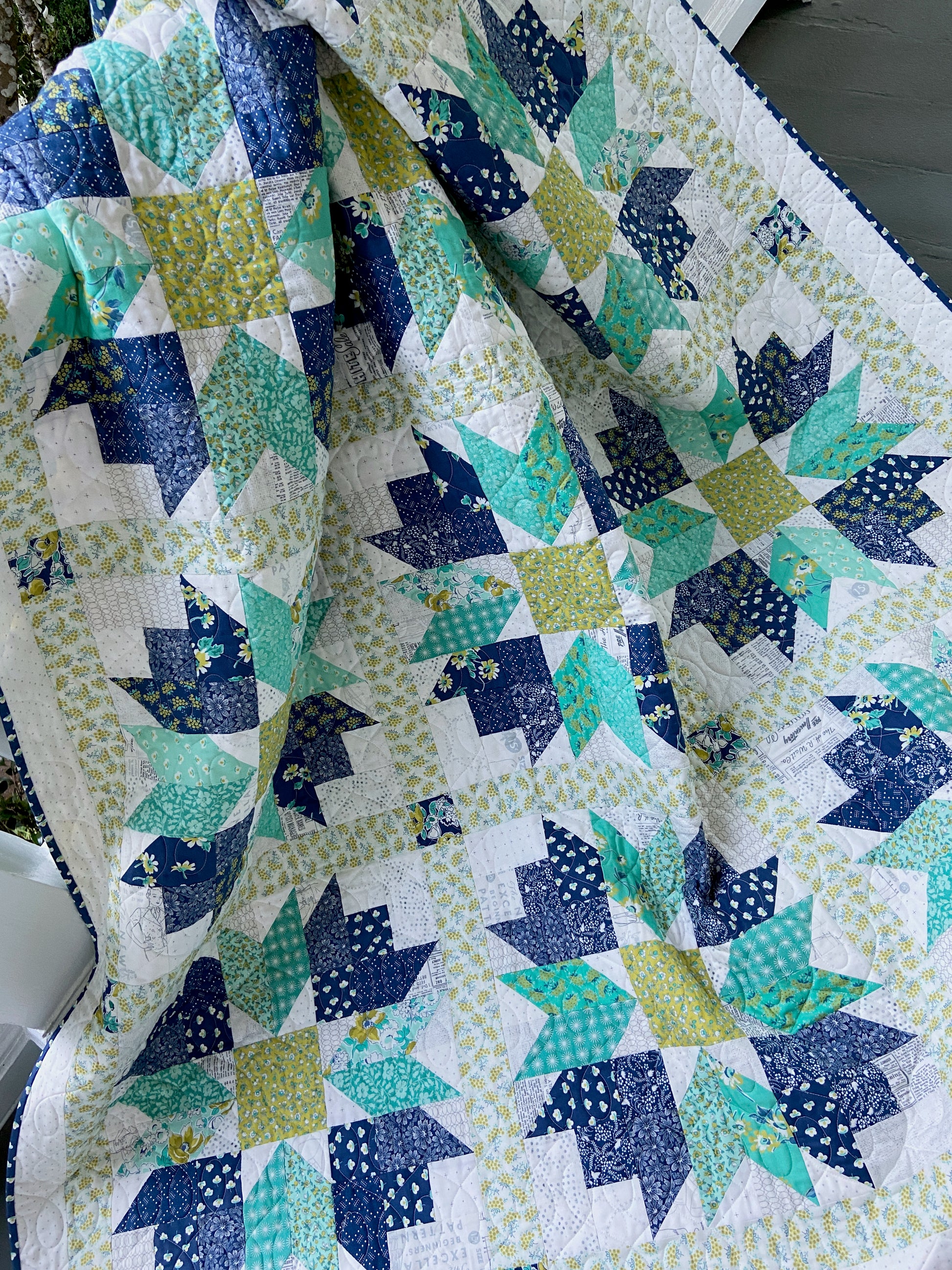 There was a little cottage garden at the end of my grandmother's mountain home filled with one of her favorite flowers - Bachelor Buttons. With their layers of pointed petals in shades of blue, I loved laying in the grass next to them as they blew in the breeze against the bright sky. The Bachelor Button Quilt is the multiplication of the barn quilt version and has me wishing for those incredible summer days!