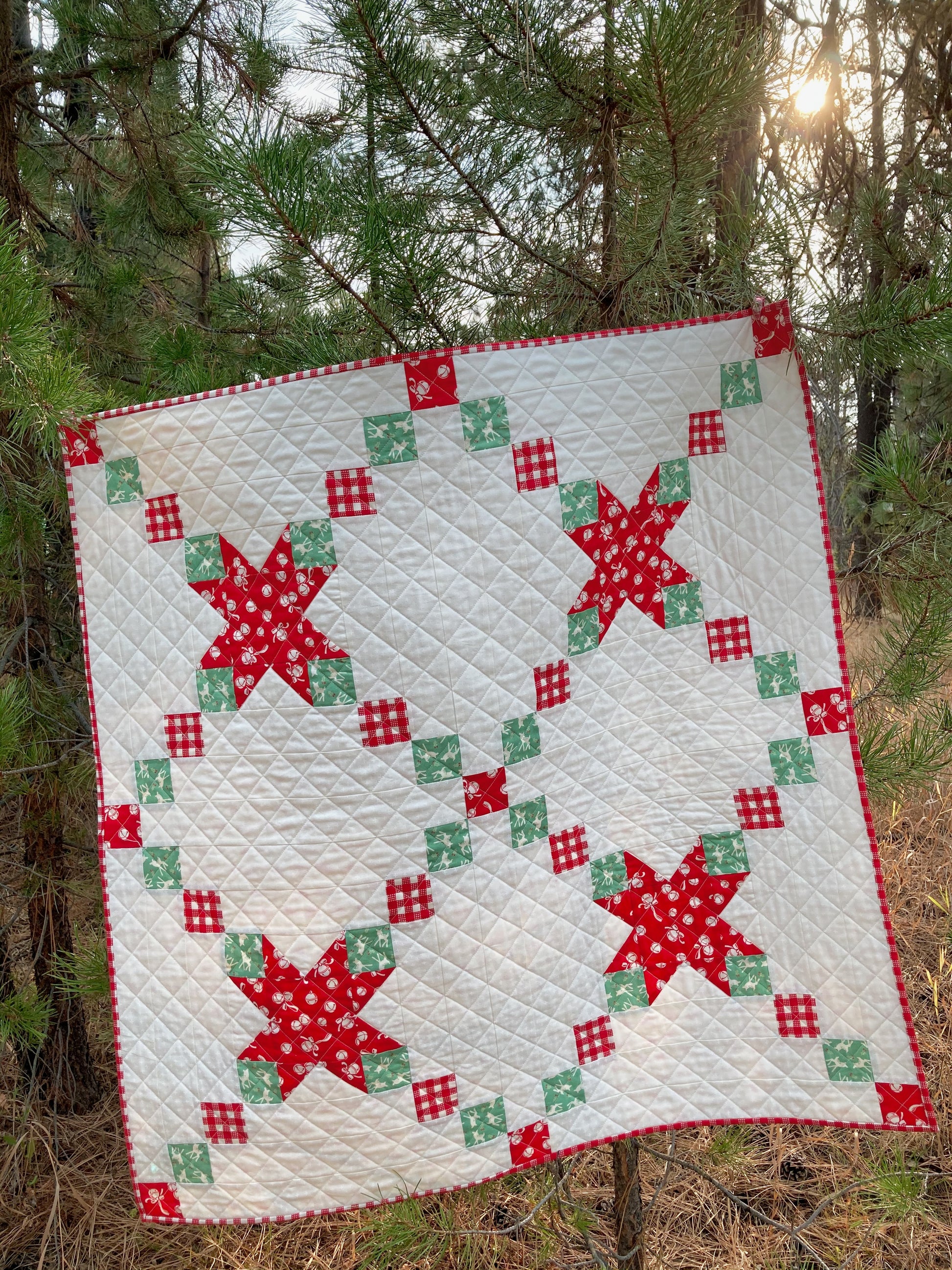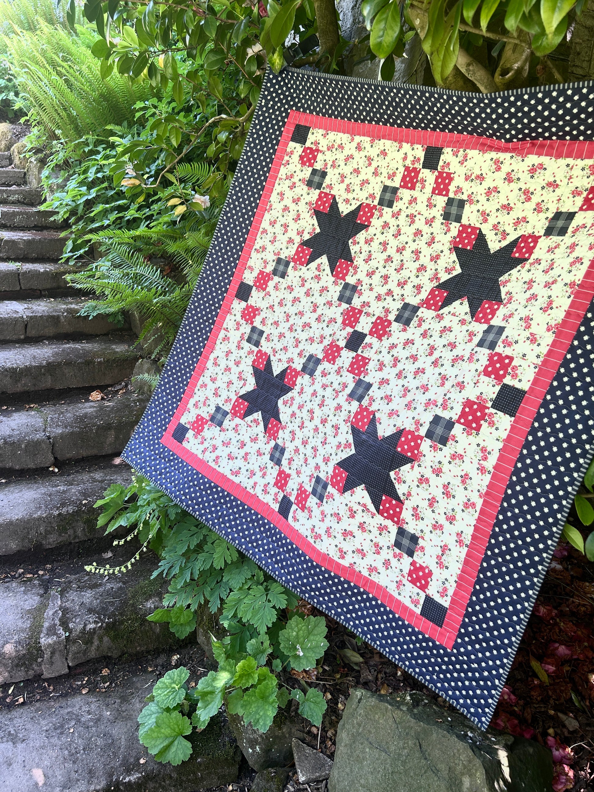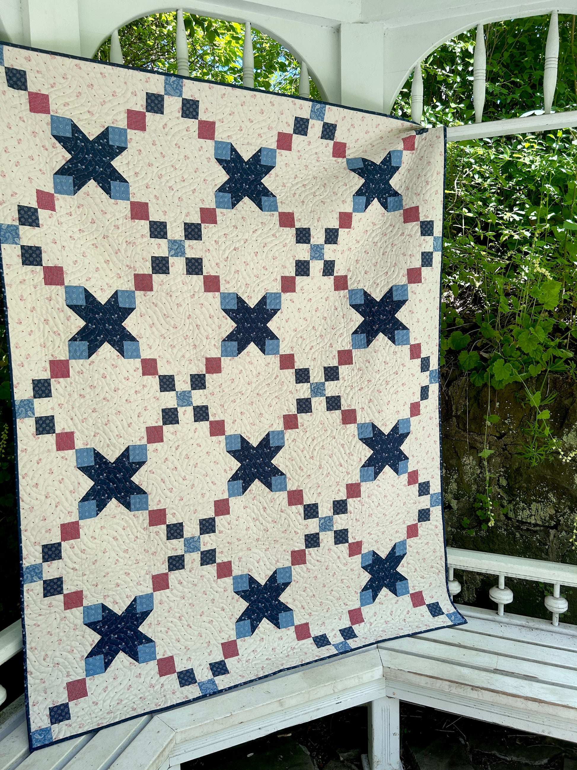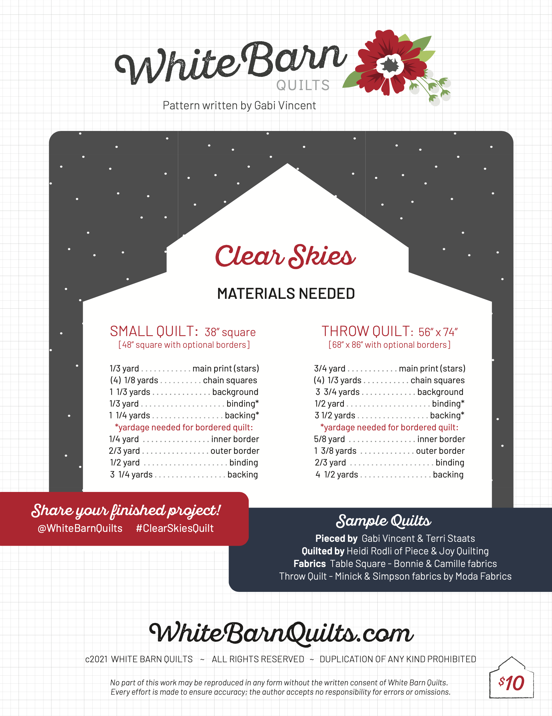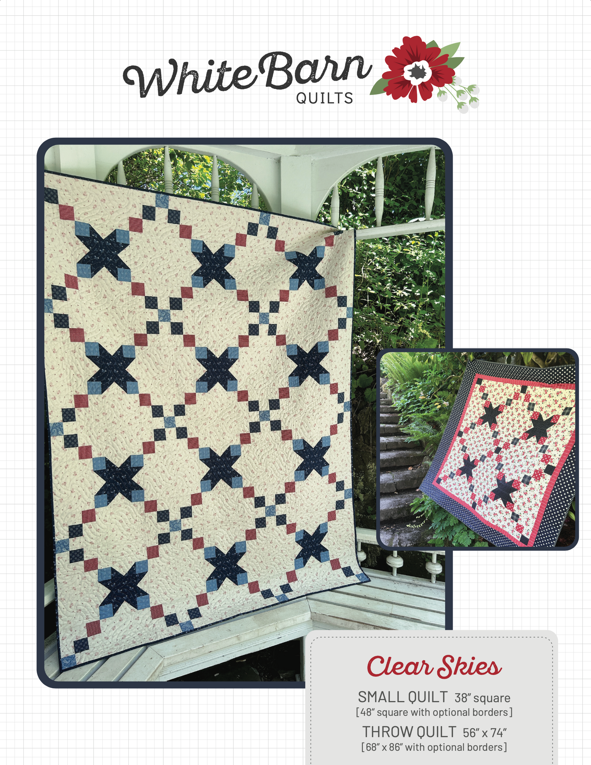 Clear Skies is a wonderfully versatile pattern - with two basic sizes and additional border options, there are so many possibilities! One of my favorite quilt blocks is the crisp and classic Sawtooth Star, and when mixed with an Irish Chain layout, I just love the open white space it creates. The chain blocks are all strip-pieced, so these projects go together really quickly! The square version would be perfect as a baby quilt too. I hope you love this quick piece pattern as much as I do!